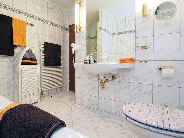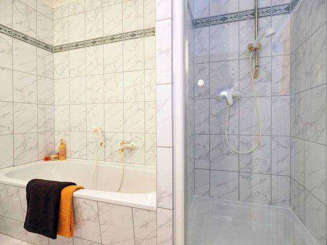 Auf der gegenüberliegenden Seite befindet sich der Eingang des Bades. Hier erwarten Sie neben einer Dusche auch eine Badewanne für entspannte Stunden. Ein Gäste-WC, vom Flur aus begehbar, sorgt für zusätzlichen Komfort.