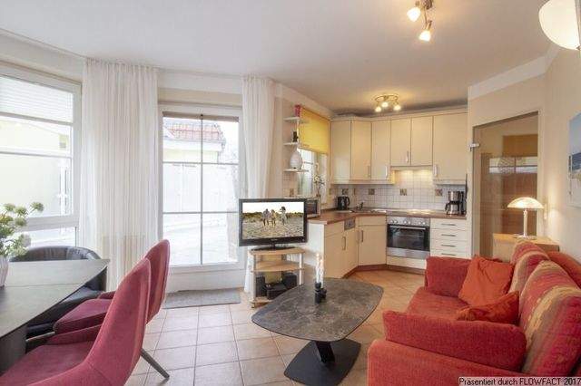 Durch eine Glastür gelangt man vom Flur in den offenen Wohnbereich. Ausgestatet mit einem gemütlichen Sofa und Sesseln sowie den angrenzenden Essbereich im Erker, bietet er viel Platz für gemeinsame Abende. Hier sind die Zugänge auf die Balkone. Die ebenfalls offen zugängliche Küche ist voll ausgestattet und lädt zum Kochen ein.