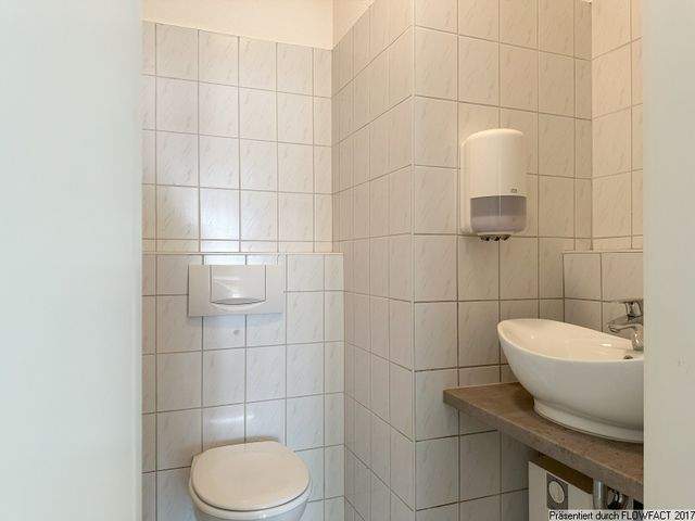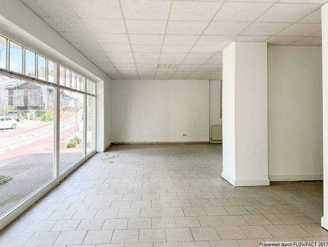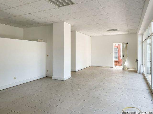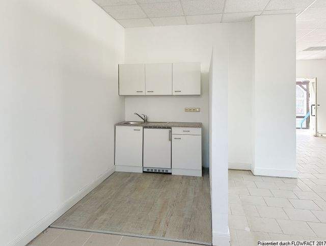 Über ein paar Stufen tritt man in den großzügigen Verkaufsraum. Durch die großen Schaufenster kommt viel Tageslicht in den Raum. Rechts befinden sich zwei voneinander getrennte Büroräume, die durch die vorhandenen Fenster sehr hell sind. Direkt daneben ist das WC. Zurück im großen Gewerberaum befindet sich an der hinteren rechten Seite eine kleine Pantryküche, die durch eine Leichtbauwand vor Kundenblicken verborgen bleibt.